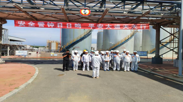 模拟中沐化工企业车间当班外操2人进入罐区巡检,发现V0601A甲醇罐根阀后法兰口泄漏,企业立即启动《公司生产安全事故综合应急预案》。各应急小组开展灭火救援工作。